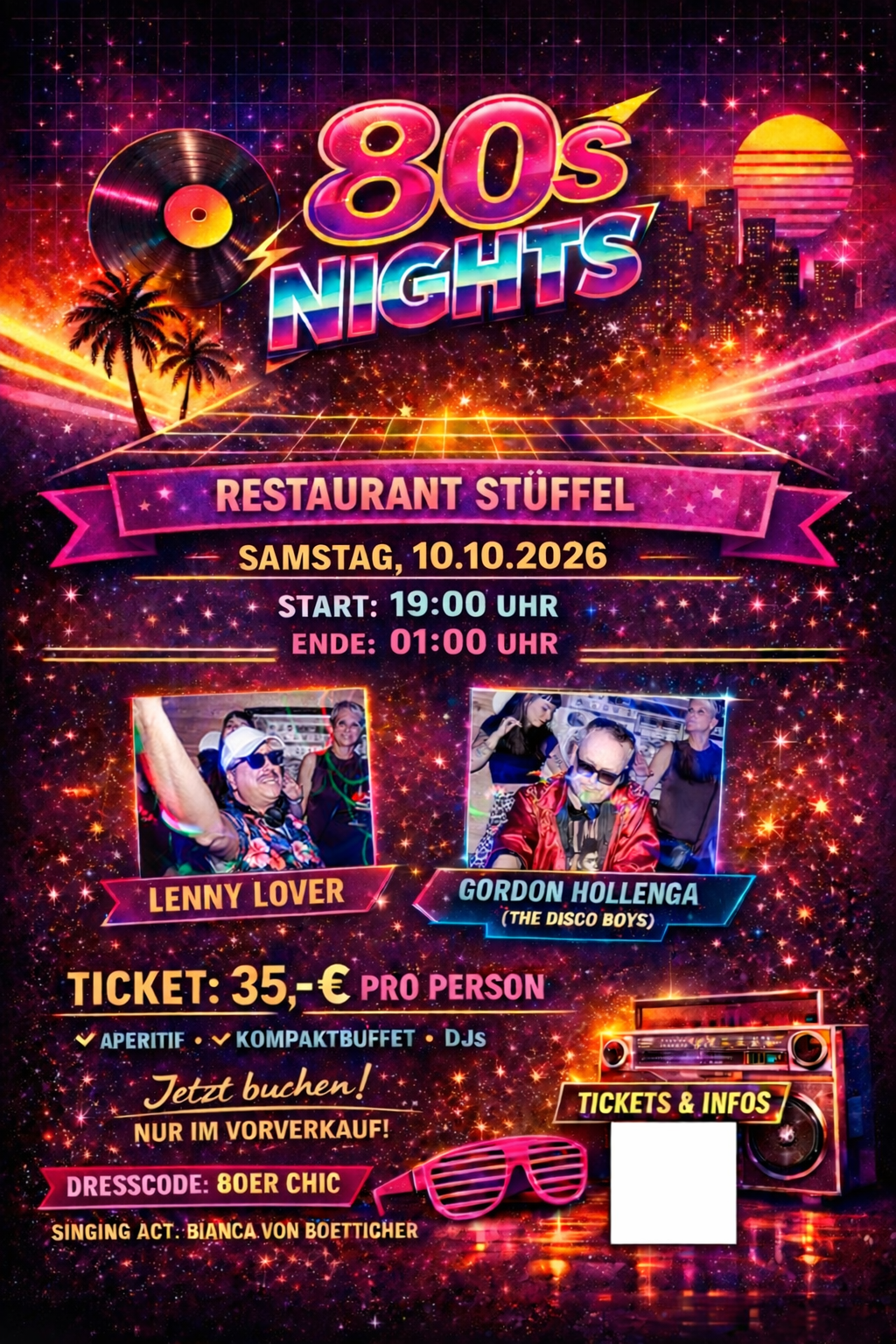 Schulterpolster an, Neonfarben raus und Haarspray nicht vergessen – wir drehen die Zeitmaschine auf volle Lautstärke! 🎶 Unsere legendären 80s Nights im edlen Restaurant Stüffel in Hamburg-Eppendorf sind mehr als nur Partys – sie sind eine Reise direkt ins Herz der knallbunten Achtziger.